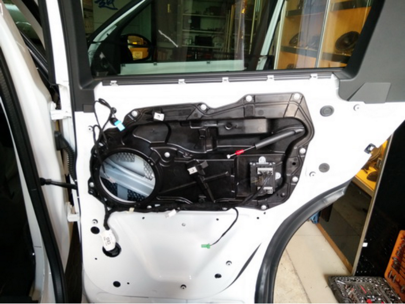 路虎原车隔音效果并不理想,一套好的音响系统一个好的听音环境是必不可少的,拆开远程门板,可以看到非常空洞